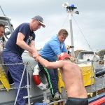 The Scottish coastline is sheer, barnacle-encrusted jagged cliffs with a few inlets and just one very small sand beach so the swimmer has to be prepared to touch the rock and return to the boat, hence the reason why good weather is vital.